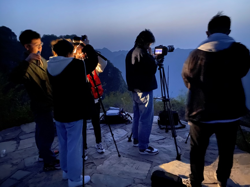 秋沟村山高林密、峡谷壁垂,自然景观有利于摄影摄像作品的创作。同学们白天在老师和指导下进行拍摄创作,晚上在驻地整理素材并剪辑制作。