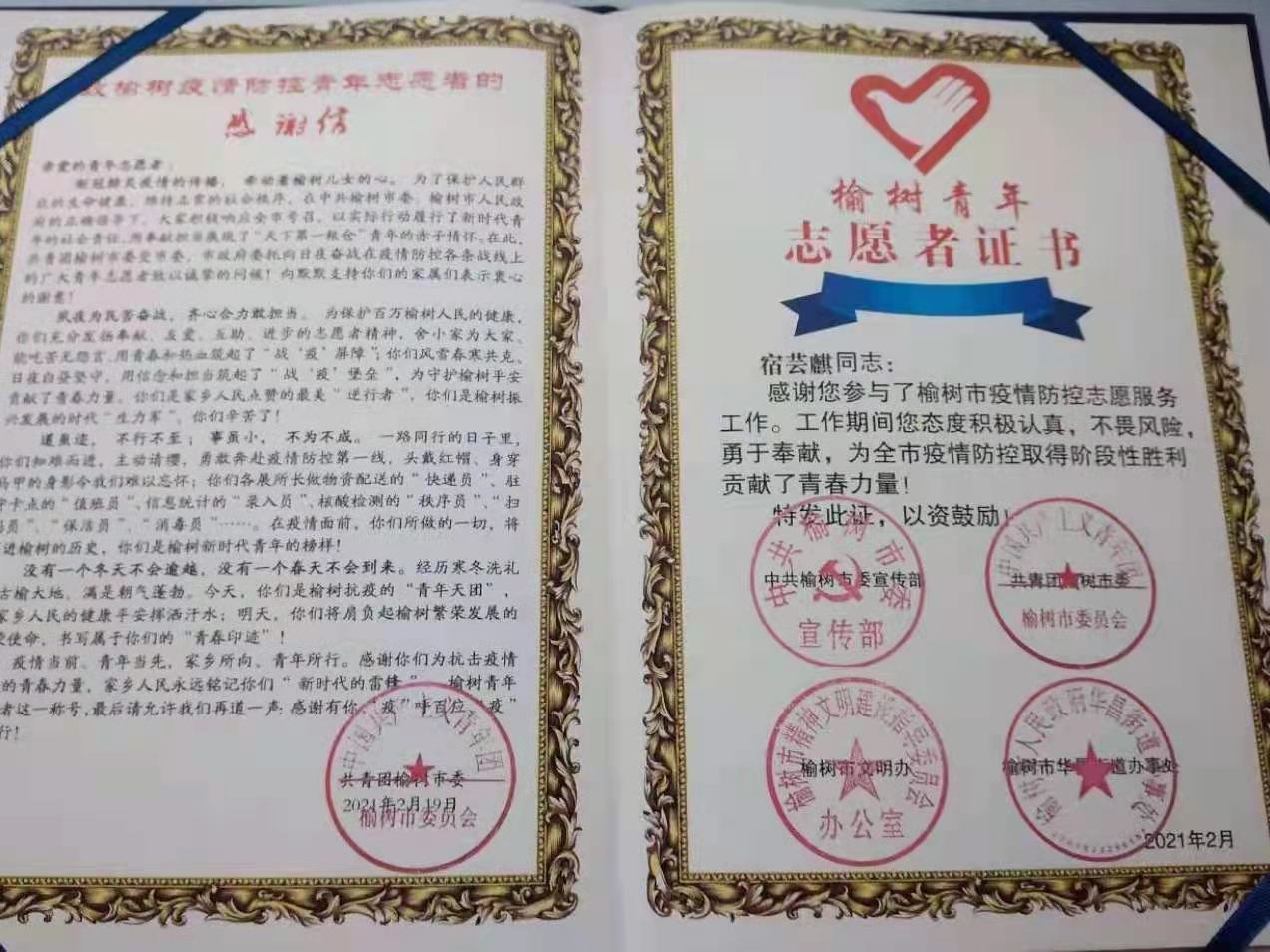 开学伊始,学校团委接到了吉林省当地抗疫部门的感谢信,得知宿芸麒在假期期间参与了抗议的志愿活动。有一份热,发一份光。就犹如萤火一般,也可以在黑暗里发出一点儿光,不必等待火炬。面对疫情,大学生应当有青年人的担当与勇气,彰显青年人的责任,严防严控,群防群控,共同筑起疫情防控的坚强堡垒,坚决打赢这场疫情防控阻击战,我们每一个大学生都应该向她学习,尽自己的力量为抗击疫情、为国家做贡献。