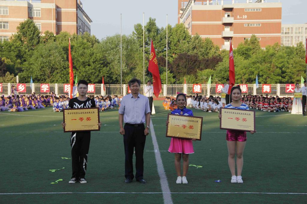 5月23日下午,我校在西区田径场隆重举行第五届健身操舞大赛。党委副书记陈贞忠、副校长吴中、杨士斌、陈业宏及各单位各学院领导出席此次活动。体育学院荆彩虹老师、汪美琪老师、李冰老师、武燕老师和焦苗苗老师等担任评委。大赛共有17个代表队参与比赛,体育学院进行专业表演展示。千余名来自各学院的同学们观看大赛。