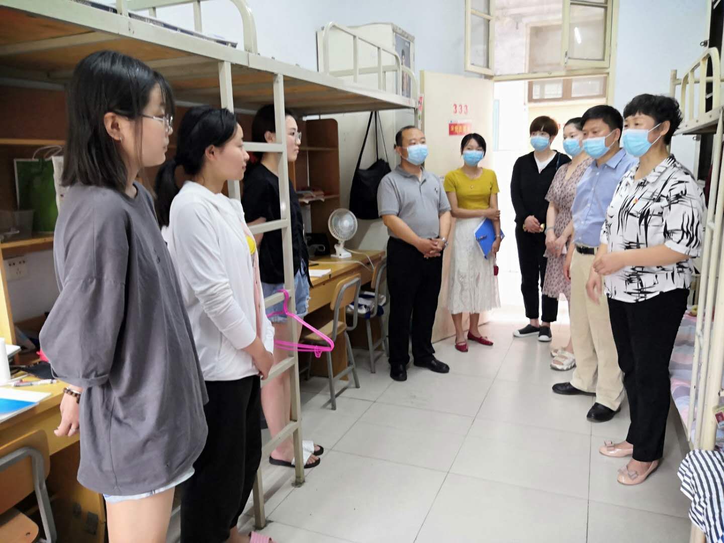 张丽伟校长在E08宿舍和学生亲切交谈,了解学生们思想、学习和生活等方面的情况,指导同学们按要求做好早午晚三次体温检测,有需求和问题及时与辅导员联系,按学校的疫情防控要求做好生活和学习安排。在东区餐厅,张校长询问了饭菜的价格并要求保证餐饮质量,提醒同学们要分时错峰就餐,避免人员聚集。在A11号楼教室,张校长与自习的同学们谈心交流,叮嘱大家做好学习的同时要注意做好自身防护,保持距离,分开落座并鼓励大家积极面对疫情,在困难中成长,争取考出好成绩。