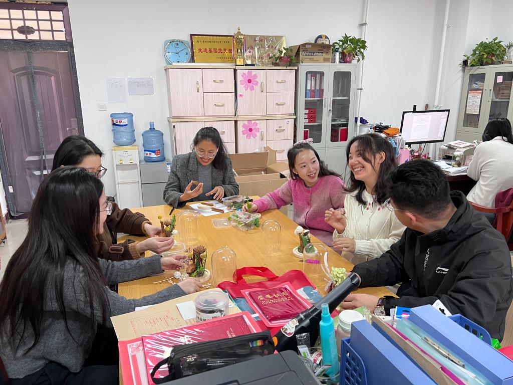 活动现场,老师们通过挑选干花素材、设计造型、搭配色彩等环节,亲手制作象征永恒祝福的永生花装饰。现场气氛轻松热烈,大家在创作中交流心得,感受艺术与自然融合的魅力,制作永生花的过程让老师们体会到专注与创造的快乐。此次活动既是对节日的献礼,也体现了学院对教职工人文关怀的重视,鼓励大家在忙碌的工作中学会悦己、传递美好。活动结束后,教职工们纷纷展示作品并合影留念,并表示这份独特的礼物既能装点生活,陶冶情操,也在交流中相互增进友谊,加深了解。