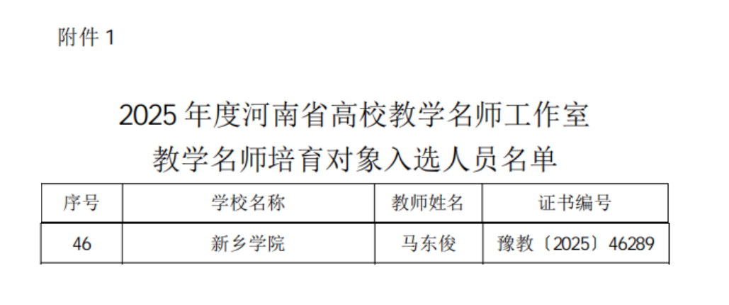 近日,河南省教育厅印发《关于公布2025年度河南省高校教学名师工作室教学名师培育对象名单的通知》(教高〔2025〕231号),全省共评选出50名省级高校教学名师培育对象。经学校推荐、省级评审,我校williamhill中国马东俊教授成功入选,成为我校第5位获此殊荣的教师。